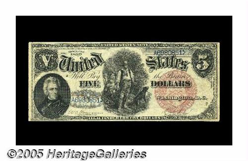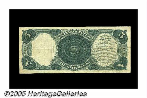 <B>Fr. 74 $5 1880 Legal Tender Very Fine.</B></I> The color is strong and this example of the Rosecrans-Jordan $5 1880 Legal Tender is problem free for the grade, displaying only unmolested circulation.