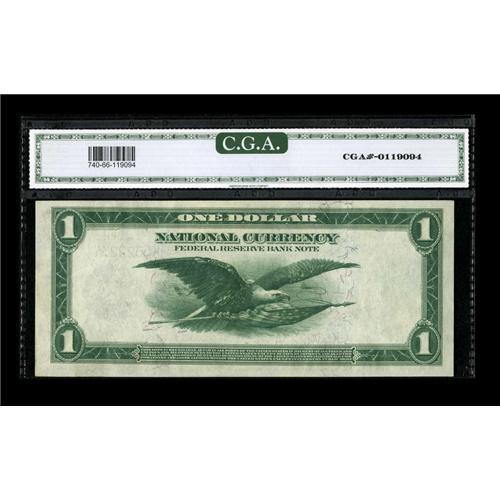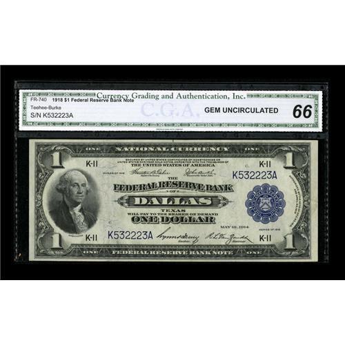 <B>Fr. 740 $1 1918 Federal Reserve Bank Note CGA Gem Uncirculated 66.</B></I> Embossing of the serial numbers and paper waves are noted through the third party holder. The overprint is bold on this Dallas Ace.<BR><BR><b>Shipping:</b> Coins & Currency (<a target="_blank" href="http://www.heritageauctions.com/common/shipping.php">view shipping information</a>)