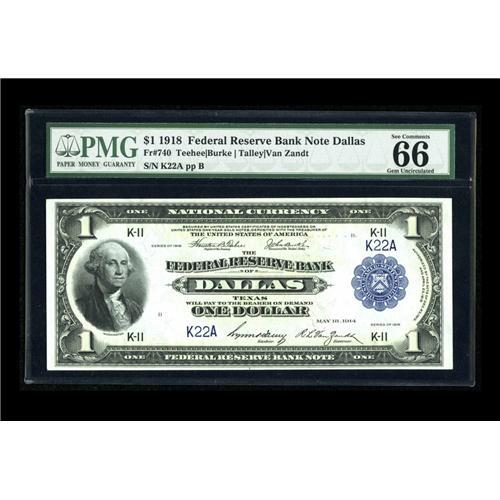 <B>Fr. 740 $1 1918 Federal Reserve Bank Note PMG Gem Uncirculated 66 EPQ.</B></I> This well preserved Dallas Ace has a double deuce serial number - 22.<BR><BR><b>Shipping:</b> Coin/Currency (<a target="_blank" href="http://www.heritageauctions.com/common/shipping.php">view shipping information</a>)