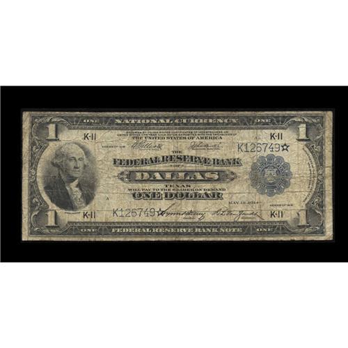 <B>Fr. 741 $1 1918 Federal Reserve Bank Note Star Very Good.</B></I> This is a plain rare note, with just four examples known to exist of this Dallas star. It's been several years since any Fr. 741 star has been available to the collecting public, and, with the small number reported, might be several more years until another is offered.<BR><I>From the Large Size Star Note Collection of Richard Merlau</B></I>