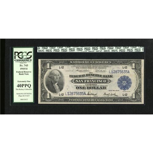 <B>Fr. 743 $1 1918 Federal Reserve Bank Note PCGS Extremely Fine 40PPQ.</B></I> Pleasing surfaces are seen on this San Fran Ace.<BR><I>From The Collection of Greg Southward</B></I><BR><BR><b>Shipping:</b> Coins & Currency (<a target="_blank" href="http://www.heritageauctions.com/common/shipping.php">view shipping information</a>)