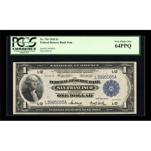 <B>Fr. 743 $1 1918 Federal Reserve Bank Note PCGS Very Choice New 64PPQ.</B></I> This embossed beauty is knocking on gem's door. <BR><I>From The Kansas City Collection.</B></I><BR><BR><b>Shipping:</b> Coins & Currency (<a target="_blank" href="http://www.heritageauctions.com/common/shipping.php">view shipping information</a>)
