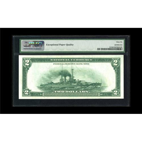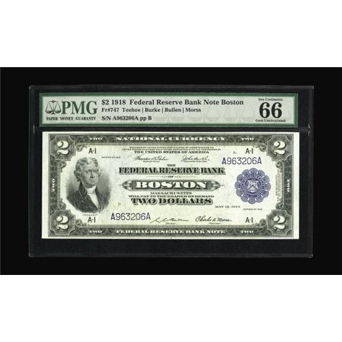 <B>Fr. 747 $2 1918 Federal Reserve Bank Note PMG Gem Uncirculated 66 EPQ.</B></I> A gorgeous Boston District Battleship with bold original embossing, ideal color, and excellent centering. Not many can compare in looks to this one.