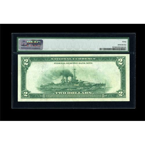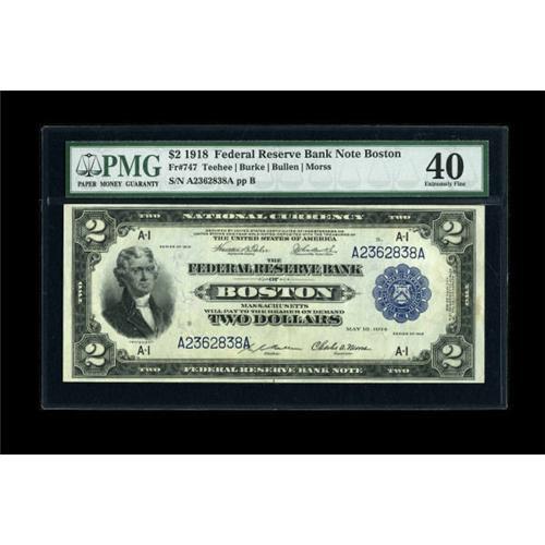 <B>Fr. 747 $2 1918 Federal Reserve Bank Note PMG Extremely Fine 40.</B></I> Light circulation did not hinder the deep embossing on this three-fold Battleship. From the face, this piece appears AU or better and is framed by solid margins.<BR><BR><b>Shipping:</b> Coins & Currency (<a target="_blank" href="http://www.heritageauctions.com/common/shipping.php">view shipping information</a>)