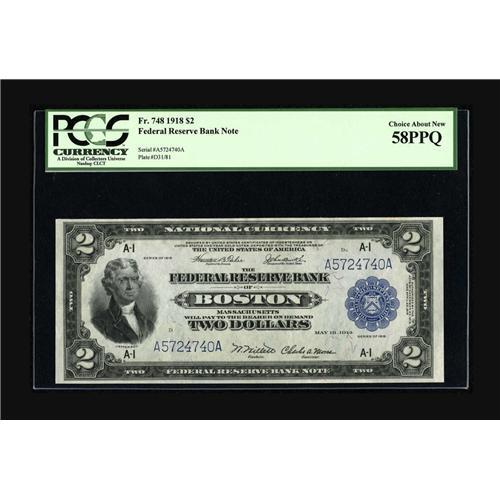 <B>Fr. 748 $2 1918 Federal Reserve Bank Note PCGS Choice About New 58PPQ.</B></I> A handsome Boston Battleship with broad margins and perfect color.<BR><BR><b>Shipping:</b> Coin/Currency (<a target="_blank" href="http://www.heritageauctions.com/common/shipping.php">view shipping information</a>)