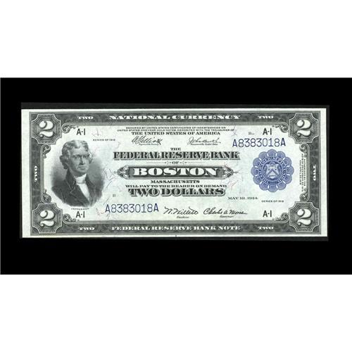 <B>Fr. 749 $2 1918 Federal Reserve Bank Note Choice New.</B></I> Excellent color and margins that approach the Gem grade. There is a very light stain in the bottom margin that shows slightly on both sides.