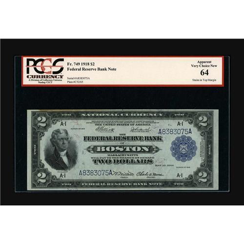 <B>Fr. 749 $2 1918 Federal Reserve Bank Note PCGS Apparent Very Choice New 64.</B></I> Plenty of originality is seen on this Beantown $5 that has some stains affecting the top margin. Is this why we shouldn't drink coffee while cataloging?<BR><BR><b>Shipping:</b> Coin/Currency (<a target="_blank" href="http://www.heritageauctions.com/common/shipping.php">view shipping information</a>)