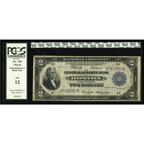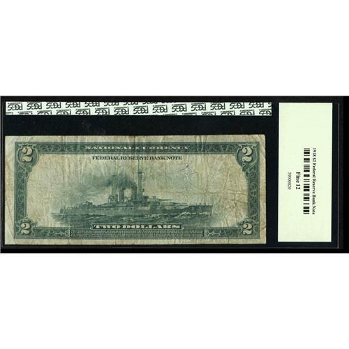 <B>Fr. 749 $2 1918 Federal Reserve Bank Note PCGS Fine 12.</B></I> This Boston Battleship has been docked within a third-party encapsulation.