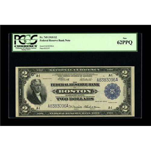 <B>Fr. 749 $2 1918 Federal Reserve Bank Note PCGS New 62PPQ.</B></I> The paper aging likely accounts for the somewhat low grade.<BR><BR><b>Shipping:</b> Coin/Currency (<a target="_blank" href="http://www.heritageauctions.com/common/shipping.php">view shipping information</a>)