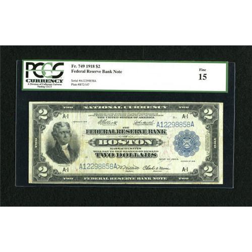 <B>Fr. 749 $2 1918 Federal Reserve Bank Note PCGS Fine 15.</B></I> A nifty Boston battleship that exhibits honest even wear.<BR><BR><b>Shipping:</b> Coins & Currency (<a target="_blank" href="http://www.heritageauctions.com/common/shipping.php">view shipping information</a>)