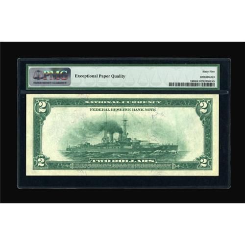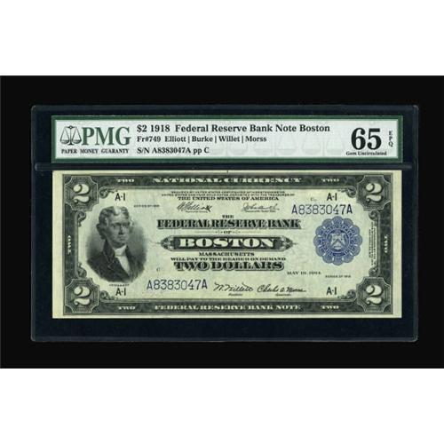 <B>Fr. 749 $2 1918 Federal Reserve Bank Note PMG Gem Uncirculated 65 EPQ.</B></I> A lovely example from a run long ago disbursed to the collecting community. The originality of this well embossed Battleship cannot be overstated. Expect this premium specimen to reach or exceed...<B><BR></B></I><I>From The Warren Marshall Collection</B></I><BR><BR><b>Shipping:</b> Coins & Currency (<a target="_blank" href="http://www.heritageauctions.com/common/shipping.php">view shipping information</a>)