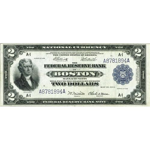 <B>Fr. 749 $2 1918 Federal Reserve Bank Note Very Fine-Extremely Fine.</B></I> This Bean Town Battleship looks to have once been wet, but the crispness and color still remain.