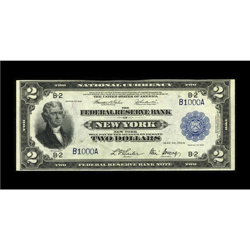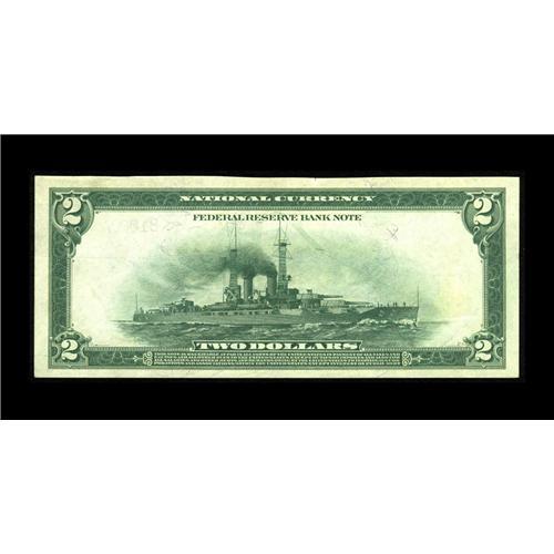 <B>Fr. 750 $2 1918 Federal Reserve Bank Note Choice About New.</B></I> This boldly printed Battleship boasts the appealing serial number B1000A. It is interesting to note that despite a number of low serial number notes are known of this issue, most pieces have not been seen in the marketplace in over a decade. Clearly uncirculated, this piece has a touch too much handling to lay claim to that grade. The deeply printed design shows a very tight top margin and a tiny margin nick.<BR><I>From The Bill and Kathy Stella Currency Collection</B></I><BR><BR><b>Shipping:</b> Coin/Currency (<a target="_blank" href="http://www.heritageauctions.com/common/shipping.php">view shipping information</a>)