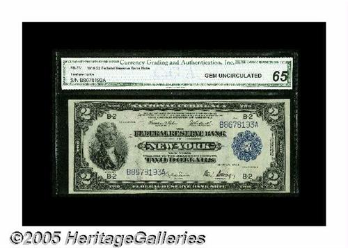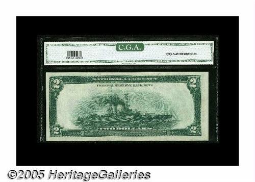 <B>Fr. 751 $2 1918 Federal Reserve Bank Note CGA Gem Uncirculated 65.</B></I> The embossing on this New York District Battleship Deuce can be easily seen through the holder. It's a handsome, well-margined piece that would likely have graded 66 or better, if the back design were not centered a bit toward the left.