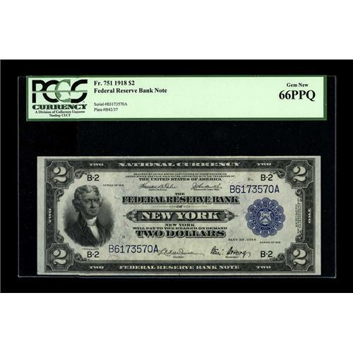 <B>Fr. 751 $2 1918 Federal Reserve Bank Note PCGS Gem New 66PPQ.</B></I> About 100 examples of this note are known--the highest PCGS piece auctioned prior to this was a 65PPQ which realized over $4,000 last March. This gorgeous 66PPQ exhibits deep embossing, and is surrounded by broad, even margins on both sides.<BR><I>From The Bill and Kathy Stella Currency Collection</B></I><BR><BR><b>Shipping:</b> Coin/Currency (<a target="_blank" href="http://www.heritageauctions.com/common/shipping.php">view shipping information</a>)