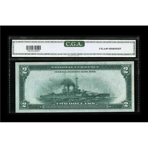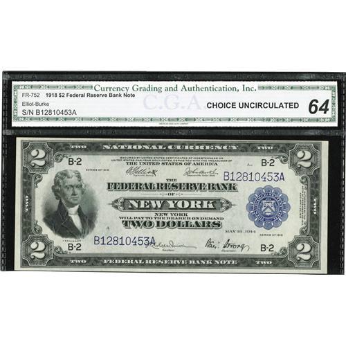 <B>Fr. 752 $2 1918 Federal Reserve Bank Note CGA Choice Uncirculated 64.</B></I> Embossing and nice color are seen through the third-party encapsulation.
