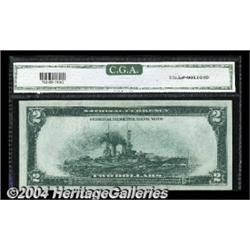 Fr. 752 $2 1918 Federal Reserve Bank Note CGA Gem New 65. The original embossing can be easily seen through the third party holder on this New York District Battleship two. It's very nicely centered on both sides and has certainly appeared to have earned its Gem designation. <BR><BR><B>Important notice:</B> Heritage usually auctions material at the rate of 200-250 lots per hour. On some occasions eBay Live bid software or the Internet may not be able to keep up with the pace of the auction. We recommend placing a realistic absentee bid now as insurance to avoid disappointment. Occasionally the auctioneer may eliminate or reject an eBay Live bid, and the auctioneer may also reopen a lot after the close of the eBay live bidding (usually because we missed an audience bid), and may reject your bid even if it shows you as the winning bidder. By bidding via eBay Live, you agree that Heritage may award the lot to another bidder at its sole discretion under the circumstances described above or any other reasonable circumstances. Since eBay bids are not shown to us until we open the lot on the floor, we treat those bids just like floor bids. In most cases the floor responds before the eBay bid is presented to us, due to Internet lag time, so for consistency we have made it a policy that floor bids are always considered first over tie eBay live bids. Also please note that all Heritage lots purchased through eBay Live carry a 20% Buyer's Premium. Please make sure you read the Terms and Conditions before you bid. <BR><BR><B>IMPORTANT ANNOUNCEMENT ABOUT RESERVES:</B> Heritage now divulges all reserves on its web site 7 days before every auction. If you want to know whether the reserve on this lot has been met, and if not, what the reserve amount is, please visit this lot page on the HeritageCoin.com web site, or email: bid@HeritageGalleries.com
