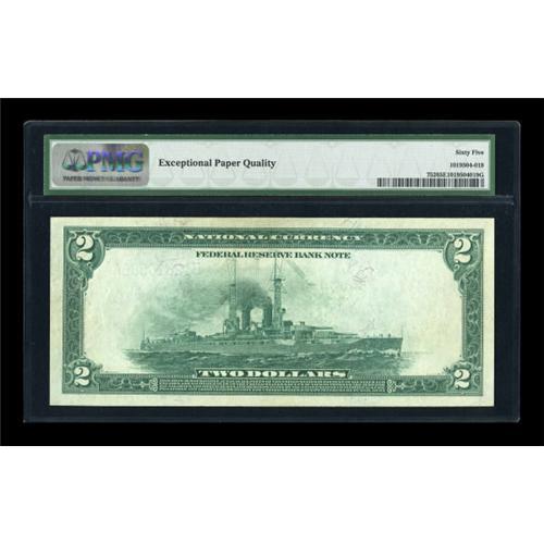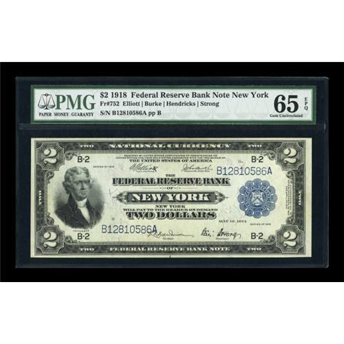 <B>Fr. 752 $2 1918 Federal Reserve Bank Note PMG Gem Uncirculated 65 EPQ.</B></I> This attractive Battleship boasts razor sharp corners and a bold blue overprint. The last similarly graded Deuce from the New York district sold for more than $3700.<BR><BR><b>Shipping:</b> Coins & Currency (<a target="_blank" href="http://www.heritageauctions.com/common/shipping.php">view shipping information</a>)
