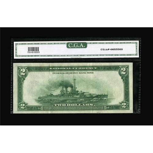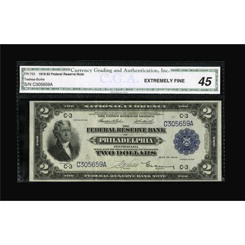 <B>Fr. 753 $2 1918 Federal Reserve Bank Note CGA Extremely Fine 45.</B></I> Two folds account for the grade on this pleasingly bright Battleship.<BR><BR><b>Shipping:</b> Coins & Currency (<a target="_blank" href="http://www.heritageauctions.com/common/shipping.php">view shipping information</a>)