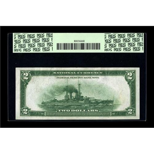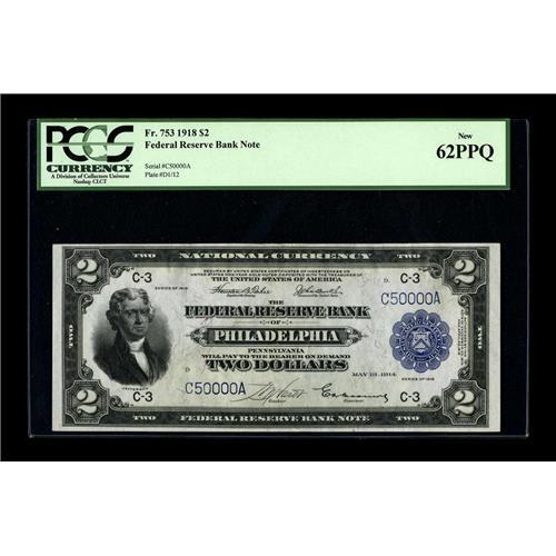 <B>Fr. 753 $2 1918 Federal Reserve Bank Note PCGS New 62PPQ.</B></I> This Philadelphia Battleship has the nice round Serial Number C50000A. The original embossing can be easily seen through the holder, and it appears that the note was held from the Gem grade because of the handling mark at the top center.<BR><I>From The Bill and Kathy Stella Currency Collection</B></I><BR><BR><b>Shipping:</b> Coin/Currency (<a target="_blank" href="http://www.heritageauctions.com/common/shipping.php">view shipping information</a>)