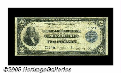 <B>Fr. 753 $2 1918 Federal Reserve Bank Note Star Very Good-Fine.</B></I> This piece, which has been off the market for nearly ten years since Richard Merlau obtained it in 1996, was unique then and remains unique today. It is a well-circulated specimen with a repaired top corner, but how often does the opportunity to obtain any unique mainstream currency item come along in today's market at any price? Expect to see some spirited competition before the hammer falls here tonight. <I>From the collection of Richard Merlau.</B></I>