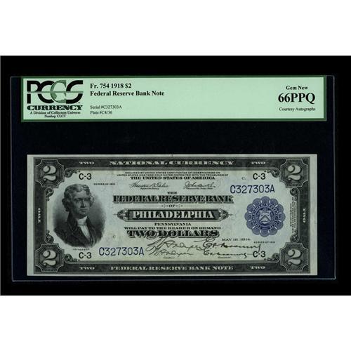 <B>Fr. 754 $2 1918 Federal Reserve Bank Note Courtesy Autographed PCGS Gem New 66PPQ.</B></I> The last time a dual courtesy autographed example on this district was sold by us was this note's sheetmate in September 2003. The signatures of Dyer and Passmore appear above their engraved signatures. The note realized over $3000 at that time. In a stronger market for high quality Large Size Type, expect a realization on this piece in the area of...<BR><BR><b>Shipping:</b> Coin/Currency (<a target="_blank" href="http://www.heritageauctions.com/common/shipping.php">view shipping information</a>)