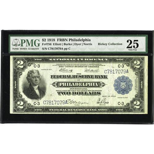 <B>Fr. 756 $2 1918 Federal Reserve Bank Note PMG Very Fine 25.</B></I> Most recently we sold a VF graded note in our 2006 Central States Signature Auction for nearly $600. Clearly this issue is worth a premium and with only a few pieces appearing each year, this pleasingly original example should not be passed over.<BR><I>Ex: Rickey Collection</B></I>