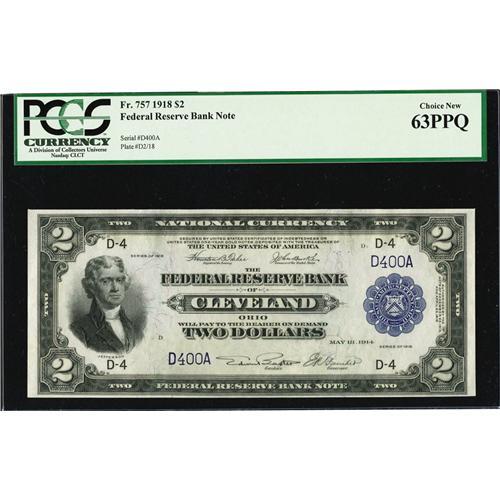 <B>Fr. 757 $2 1918 Federal Reserve Bank Note PCGS Choice New 63PPQ.</B></I> This fancy serial number beauty would look nice in any collection. Original surfaces are easily seen within the holder.