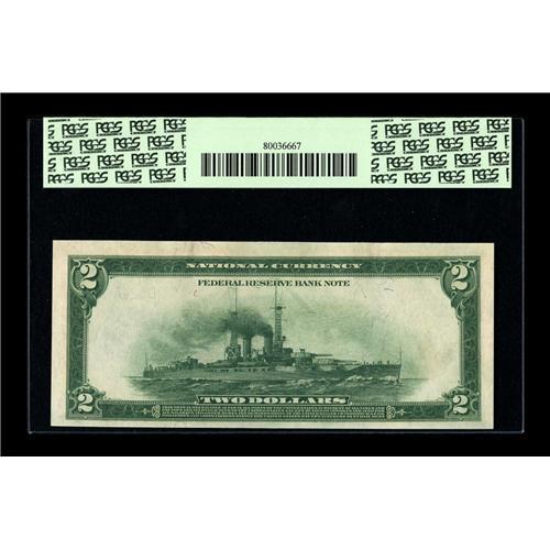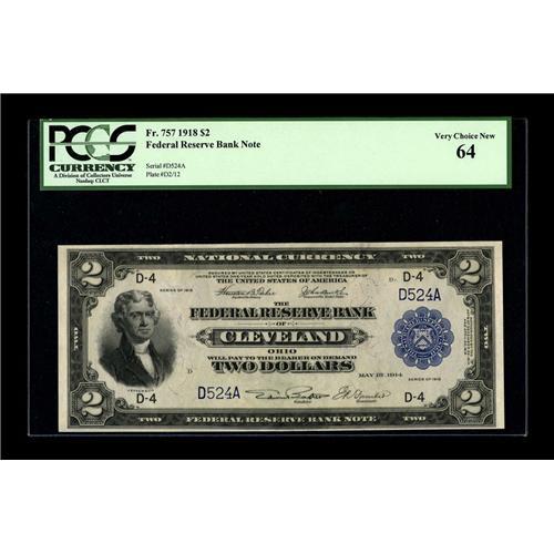<B>Fr. 757 $2 1918 Federal Reserve Bank Note PCGS Very Choice New 64.</B></I> This Cleveland Battleship has a three-digit serial number and a nice overall appearance in spite of slightly mellowed paper color.<BR><I>From The Bill and Kathy Stella Currency Collection</B></I><BR><BR><b>Shipping:</b> Coin/Currency (<a target="_blank" href="http://www.heritageauctions.com/common/shipping.php">view shipping information</a>)