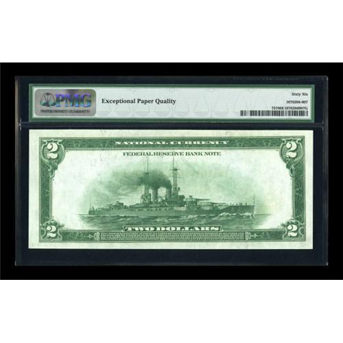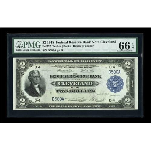 <B>Fr. 757 $2 1918 Federal Reserve Bank Note PMG Gem Uncirculated 66 EPQ.</B></I> A beautifully bright three-digit example from the Cleveland District. PMG has graded only around forty 66 Battleships with just two higher. This one is enhanced by its three-digit serial number. Incredibly deep original embossing also highlights this beautifully centered, fully colored Deuce. <BR><BR><b>Shipping:</b> Coins & Currency (<a target="_blank" href="http://www.heritageauctions.com/common/shipping.php">view shipping information</a>)