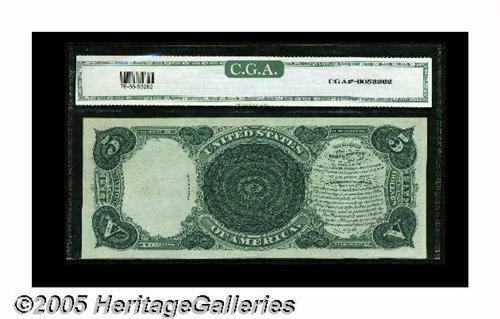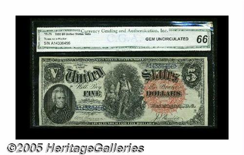 <B>Fr. 76 $5 1880 Legal Tender CGA Gem Uncirculated 66.</B></I> A brightly colored, original-appearing example of this much scarcer Pioneer number. The embossing is visible throughout this Gem and is deeply impressed enough to be easily seen through the third-party holder. A pristine type note that is likely to please any bidder, this is a Gem in anyone's book.