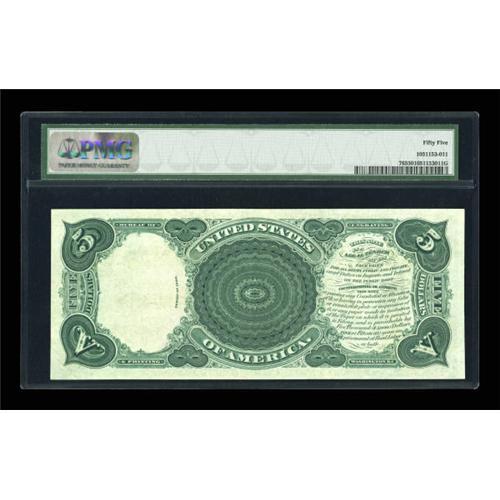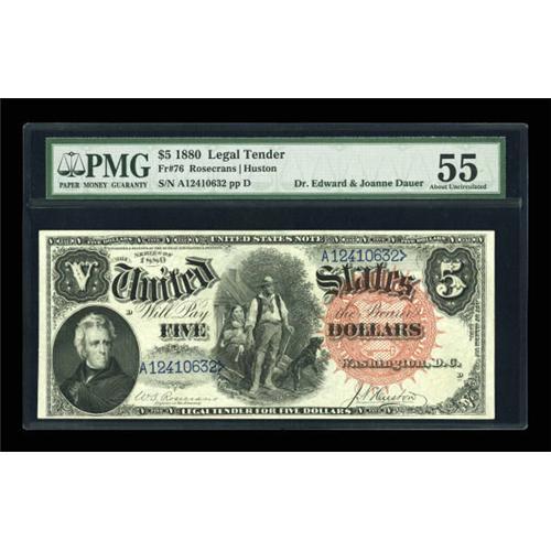 <B>Fr. 76 $5 1880 Legal Tender PMG About Uncirculated 55</B></I>. PMG has graded only five Fr. 76s - four of which are AUs with one other heavily circulated. The low number of pieces graded fits right in with the census where less than 60 examples of this number are known in all grades combined. To date, no Fr. 76 has been PMG graded above the 58 level. This note has the appearance of a Choice Uncirculated piece. It has been used by the Dauers to illustrate the Large Red Spiked Seal Blue Serial number type in their massive book on Page 76. <BR><I>From The Dr. Edward & Joanne Dauer Collection</B></I><BR><BR><b>Shipping:</b> Coins & Currency (<a target="_blank" href="http://www.heritageauctions.com/common/shipping.php">view shipping information</a>)