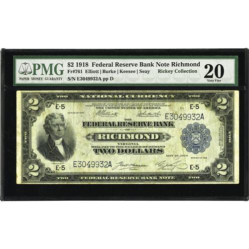 <B>Fr. 761 $2 1918 Federal Reserve Bank Note PMG Very Fine 20.</B></I> The known survivors of this issue number about three dozen, but only about a half dozen have been available over the last half decade or so. Most recently we sold a VF for more than $600.<BR><I>Ex: Rickey Collection</B></I>