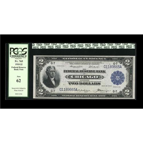 <B>Fr. 765 $2 1918 Federal Reserve Bank Note PCGS New 62.</B></I> The 62 grade implies a minor flaw of some type, but through the holder, this sure looks like a 64.