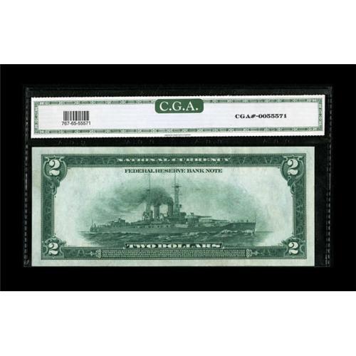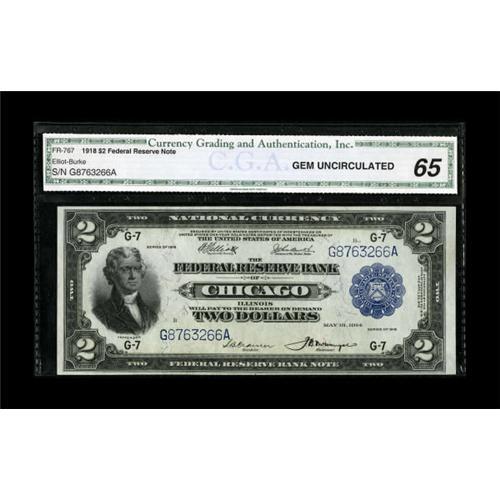 <B>Fr. 767 $2 1918 Federal Reserve Bank Note CGA Gem Uncirculated 65.</B></I> The front to back centering is near ideal on this Chicago Battleship. Consecutive to the last note.<BR><BR><b>Shipping:</b> Coins & Currency (<a target="_blank" href="http://www.heritageauctions.com/common/shipping.php">view shipping information</a>)