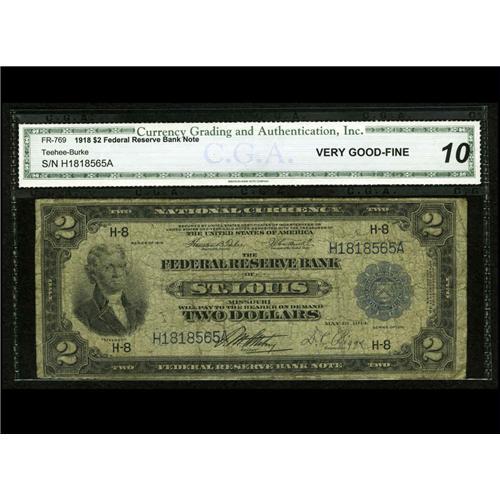 Fr. 769 $2 1918 FRBN CGA Very Good 10. 9 notes known! Fr. 769 $2 1918 Federal Reserve Bank Note CGA