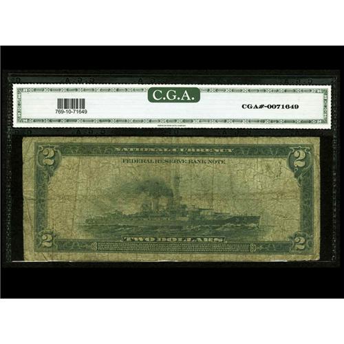 <B>Fr. 769 $2 1918 Federal Reserve Bank Note CGA Very Good-Fine 10.</B></I> The census of nine known notes makes this the rarest Battleship number. The note is well circulated to be sure, but it exhibits no problems that are not wholly commensurate with its assigned grade.