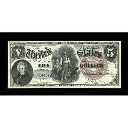 <B>Fr. 77 $5 1880 Legal Tender Extremely Fine.</B></I> This handsome note is consecutive to the previous lot and it too has original paper surfaces and embossing.