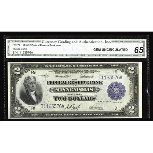 <B>Fr. 772 $2 1918 Federal Reserve Bank Note CGA Gem Uncirculated 65.</B></I> A nice Battleship, with broad, even margins and superior color. The certified grade of 65 appears to be right on the money. This note falls within a run of about 75 mostly consecutive notes, almost all of which are listed in the Gengerke census as CU.