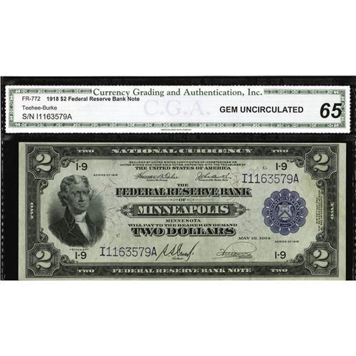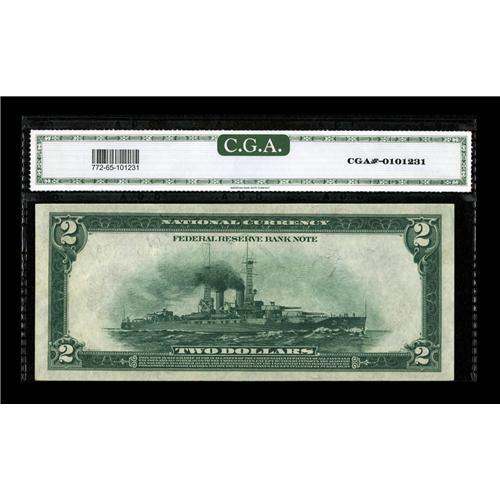 <B>Fr. 772 $2 1918 Federal Reserve Bank Note CGA Gem Uncirculated 65.</B></I> A nice Battleship, with broad, even margins and superior color. The certified grade of 65 appears to be right on the money. This note falls within a run of about 75 mostly consecutive notes, almost all of which are listed in the Gengerke census as CU.