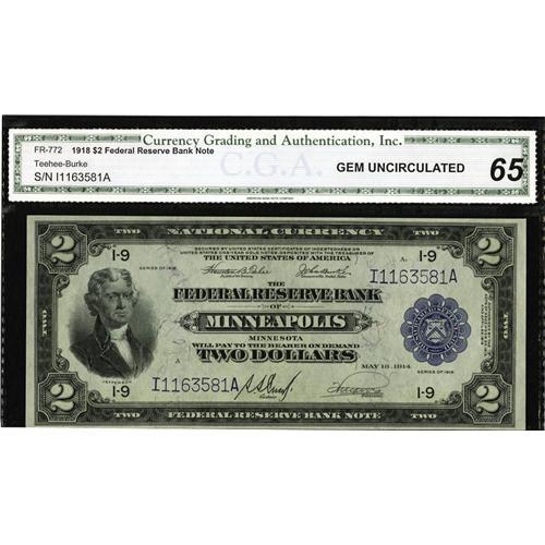 <B>Fr. 772 $2 1918 Federal Reserve Bank Note CGA Gem Uncirculated 65.</B></I> Another note from the scarcer Minneapolis district which is just as nice as the previous lot.