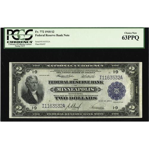 <B>Fr. 772 $2 1918 Federal Reserve Bank Note PCGS Choice New 63PPQ.</B></I> The grade certainly fits on this example put away over 25 years ago which is within the run that most new notes came from.