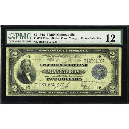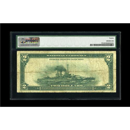 <B>Fr. 773 $2 1918 Federal Reserve Bank Note PMG Fine 12.</B></I> The all important Battleship vignette remains bold. A total of five examples of this scarce Friedberg number have been offered at public auction in the last five years. A further survey of the census also reveals that a lone AU is the highest graded piece known. With this in mind, this piece should be worth...
