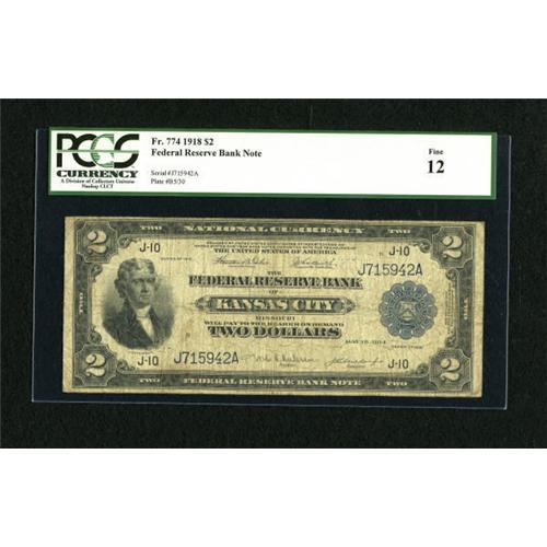 <B>Fr. 774 $2 1918 Federal Reserve Bank Note PCGS Fine 12.</B></I> This is an evenly circulated Battleship from the KC district.<BR><I>From The Kansas City Collection</B></I><BR><BR><b>Shipping:</b> Coins & Currency (<a target="_blank" href="http://www.heritageauctions.com/common/shipping.php">view shipping information</a>)