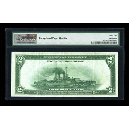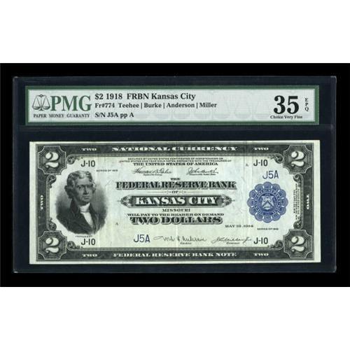 <B>Fr. 774 $2 1918 Federal Reserve Bank Note PMG Choice Very Fine 35 EPQ.</B></I> Plenty of embossing is noticed on this wonderful serial number 5 example. Single digit serial numbers on Battleships are not a common occurrence.<BR><BR><b>Shipping:</b> Coins & Currency (<a target="_blank" href="http://www.heritageauctions.com/common/shipping.php">view shipping information</a>)