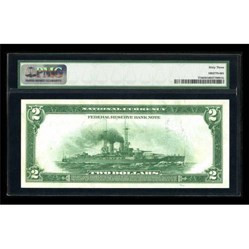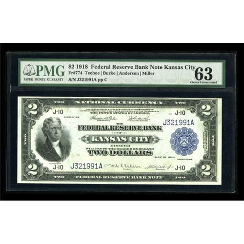 <B>Fr. 774 $2 1918 Federal Reserve Bank Note PMG Choice Uncirculated 63.</B></I> This nice Kansas City Battleship Deuce would likely have earned the Gem grade with just a touch more top face margin. We are rather surprised it is not EPQ as the original embossing can be seen through the holder. <BR><BR><b>Shipping:</b> Coins & Currency (<a target="_blank" href="http://www.heritageauctions.com/common/shipping.php">view shipping information</a>)