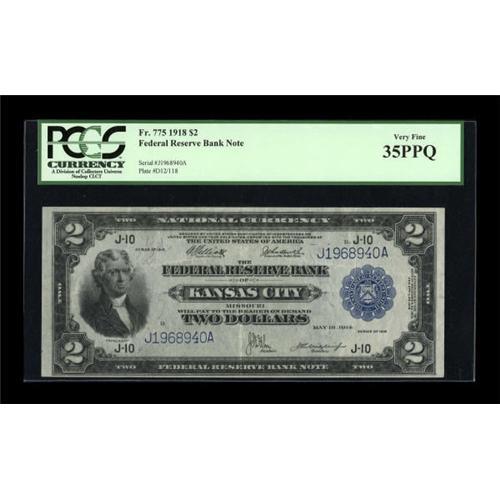 <B>Fr. 775 $2 1918 Federal Reserve Bank Note PCGS Very Fine 35PPQ.</B></I> The paper is clearly original, thus the Premium Paper Quality designation. A bold overprint complements the bright white paper.<BR><BR><b>Shipping:</b> Coins & Currency (<a target="_blank" href="http://www.heritageauctions.com/common/shipping.php">view shipping information</a>)