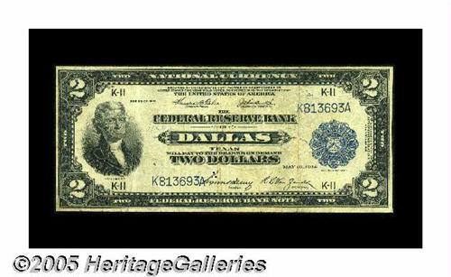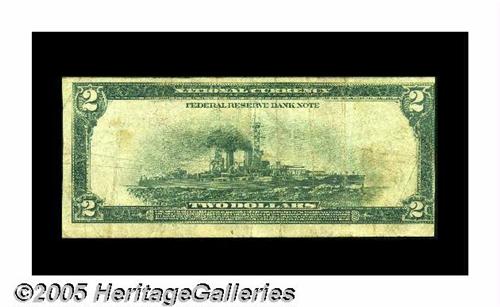 <B>Fr. 776 $2 1918 Federal Reserve Bank Note Fine.</B></I> The size of the Dallas Battleship fleet for this Friedberg number is a little bit deceiving in Gengerke with a count of 73, as over thirty of that number are in CU with serial numbers of 100 and below. The mid-grade Deuce presented here is without edge tears or pinholes. Also, the back is printed slightly askew, leaving the back right-hand frame line up against the edge.