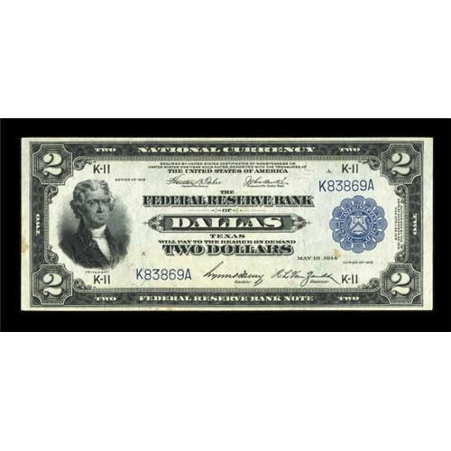 <B>Fr. 776 $2 1918 Federal Reserve Bank Note Fine.</B></I> Really closer to Very Fine; downgraded for two small stains and three separate quarter-inch tears intruding into the design from the top. Dallas Battleships are quite scarce, with the two numbers combining for only 130 known pieces.<BR><BR><b>Shipping:</b> Coins & Currency (<a target="_blank" href="http://www.heritageauctions.com/common/shipping.php">view shipping information</a>)