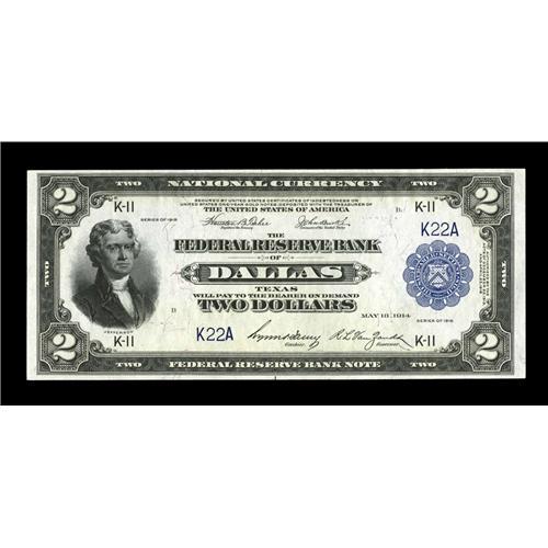 <B>Fr. 776 $2 1918 Federal Reserve Bank Note Gem New.</B></I> This note has been off the market for over ten years. Dallas is a scarce district, with only two signature combinations, and less than a hundred notes known in all grades between them. This broadly margined note has excellent original embossing, ideal color and a two-digit serial number.<BR><BR><b>Shipping:</b> Coin/Currency (<a target="_blank" href="http://www.heritageauctions.com/common/shipping.php">view shipping information</a>)